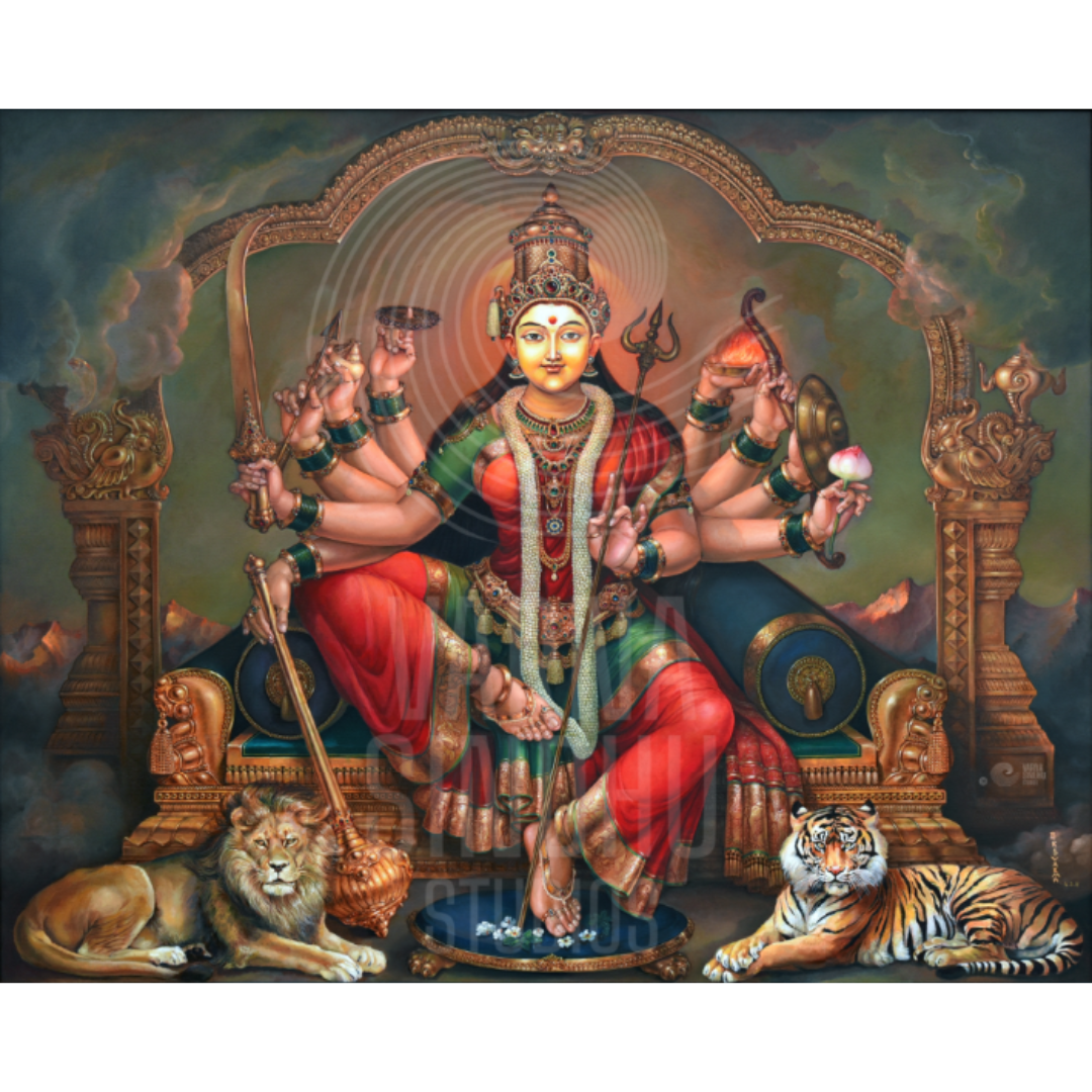 Witness the divine fury and motherly grace of Durga Devi, captured in her full glory